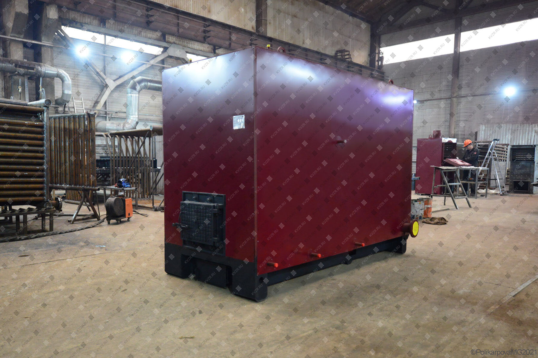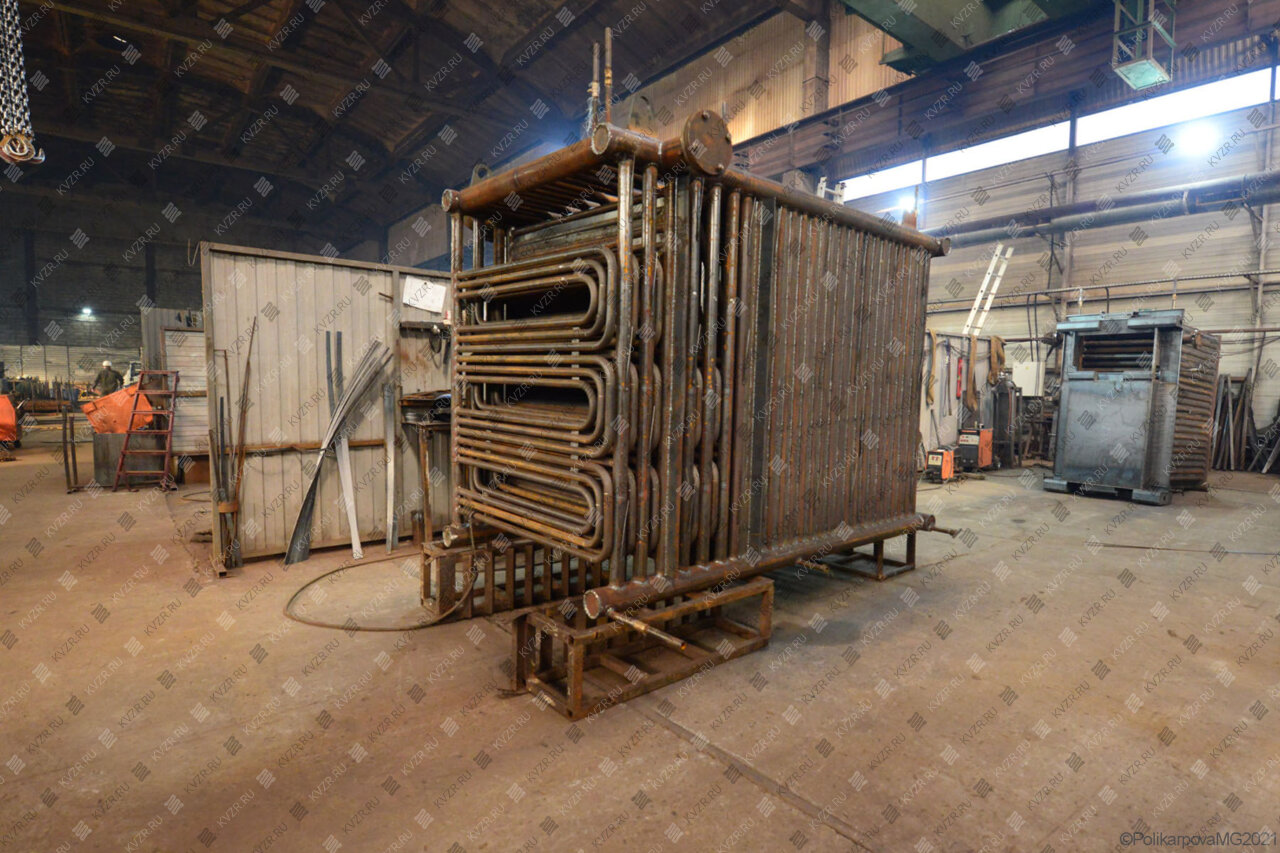 Котел с водяными колосниками выполнен моноблоком – блок котла и ручная топка. Котельный блок представляет собой сварную конструкцию, состоящую из трубной системы (радиационной и конвективной поверхности нагрева), опорной рамы и каркаса с теплоизоляционными материалами, обшитого листовой сталью. Котлоагрегаты имеют П-образную сомкнутую компоновку. Топочная камера состоит из труб Ø 57x3,5 мм и выполнена газоплотной путем плавникового оребрения.