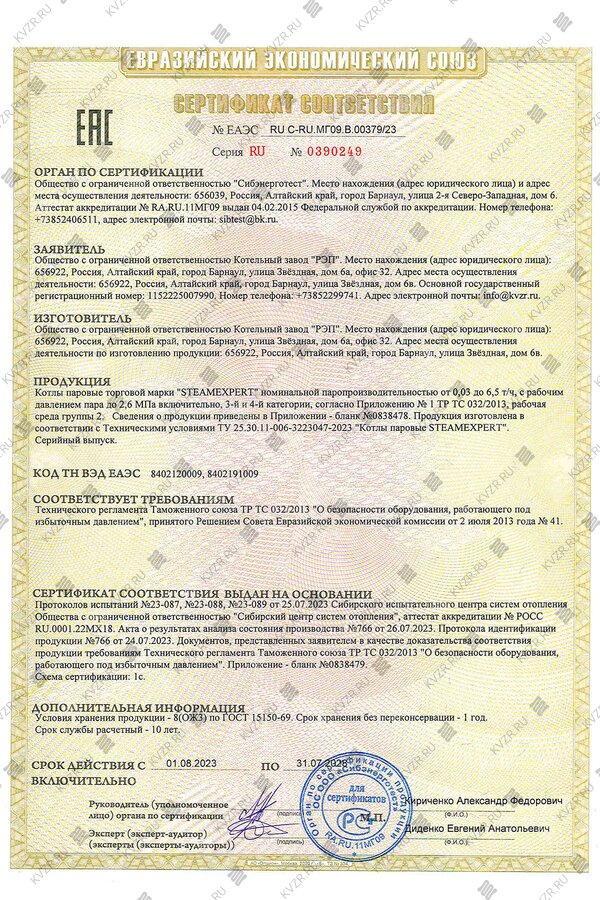 Котельным заводом получен сертификат соответствия на паровые котлы торговой марки "STEAMEXPERT" номинальной паропроизводительностью от 0,03 до 6,5 т/ч, с рабочим давлением пара до 2,6 МПа включительно, 3-й и 4-й категории, согласно Приложению № 1 ТР ТС 032/2013, рабочая среда группы 2.