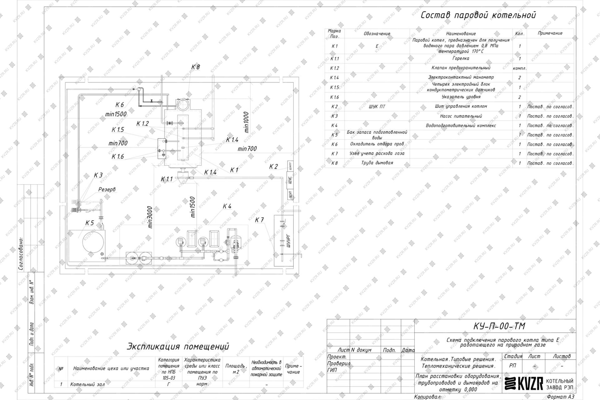 Для эффективной и надежной работы парового котла Е 1.5 0.9 Г в вашей котельной вам потребуется дополнительное оборудование - автоматика ЩУК, горелка импортного или отечественного производства, насос сетевой и подпиточный, регулятор давления газа (по необходимости), газоходы и переходники для газового тракта, дымовая труба. Мы предлагаем рассмотреть типовые варианты комплектации.
