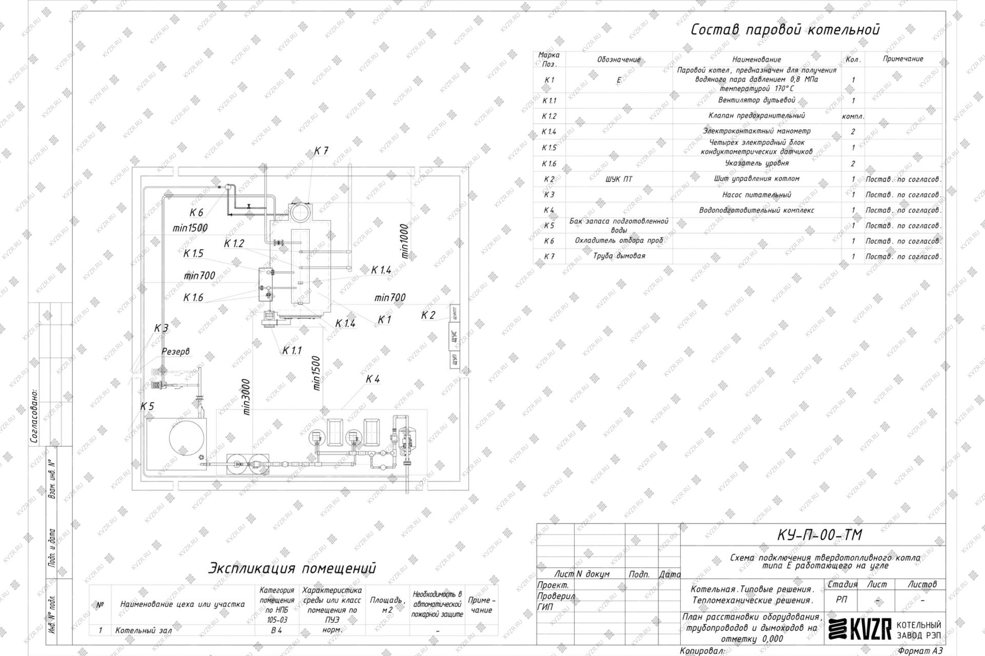 Чтобы правильно подключить твердотопливный паровой котел 1200 кг / 1.2 т пара -170°С -0,9 МПа / 9 кгс/cм² в котельной необходимо оставить проемы для обслуживания оборудования во время эксплуатации. На представленной здесь схеме обозначены их размеры. Кроме того, в данной примерной схеме монтажа паровых котлов и оборудования указан перечень минимально необходимого вспомогательного оборудования.