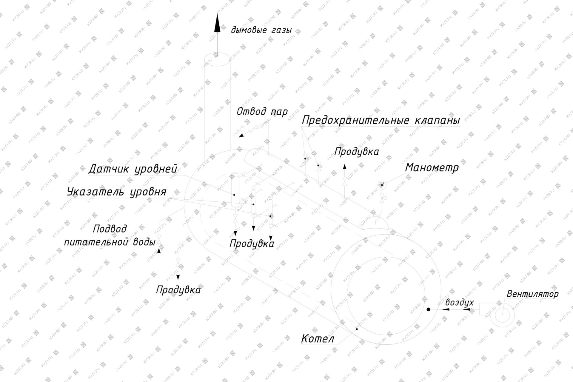 К вспомогательному оборудованию при подключении промышленного парового котла относят - щит управления котлом, питательные насосы (1 рабочий, 2 резервный), бак запаса воды, охладитель проб отбора воды, систему водоподготовки котловой воды, дымовую трубу, систему газоходов и тягодутьевых механизмов (по проекту).
