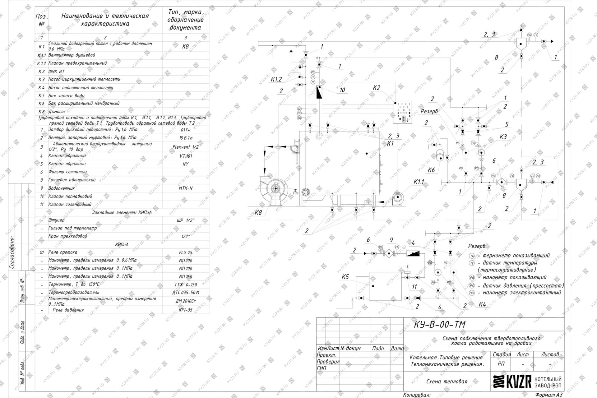 Образец тепловой схемы подключения дровяного котла на дровах 0.5 МВт и вспомогательного оборудования в котельной приведен на данной схеме. При эксплуатации очень важно грамотно осуществить подключение оборудования, установить все контрольно измерительные приборы, для контроля параметров работы котельной и запорную арматуру для оперативного переключения потока теплоносителя при плановой или аварийной остановке оборудования. Данную схему можно использовать как пример для разработки под свой объект или заказать у нас разработку индивидуальной схемы для вашей котельной.
